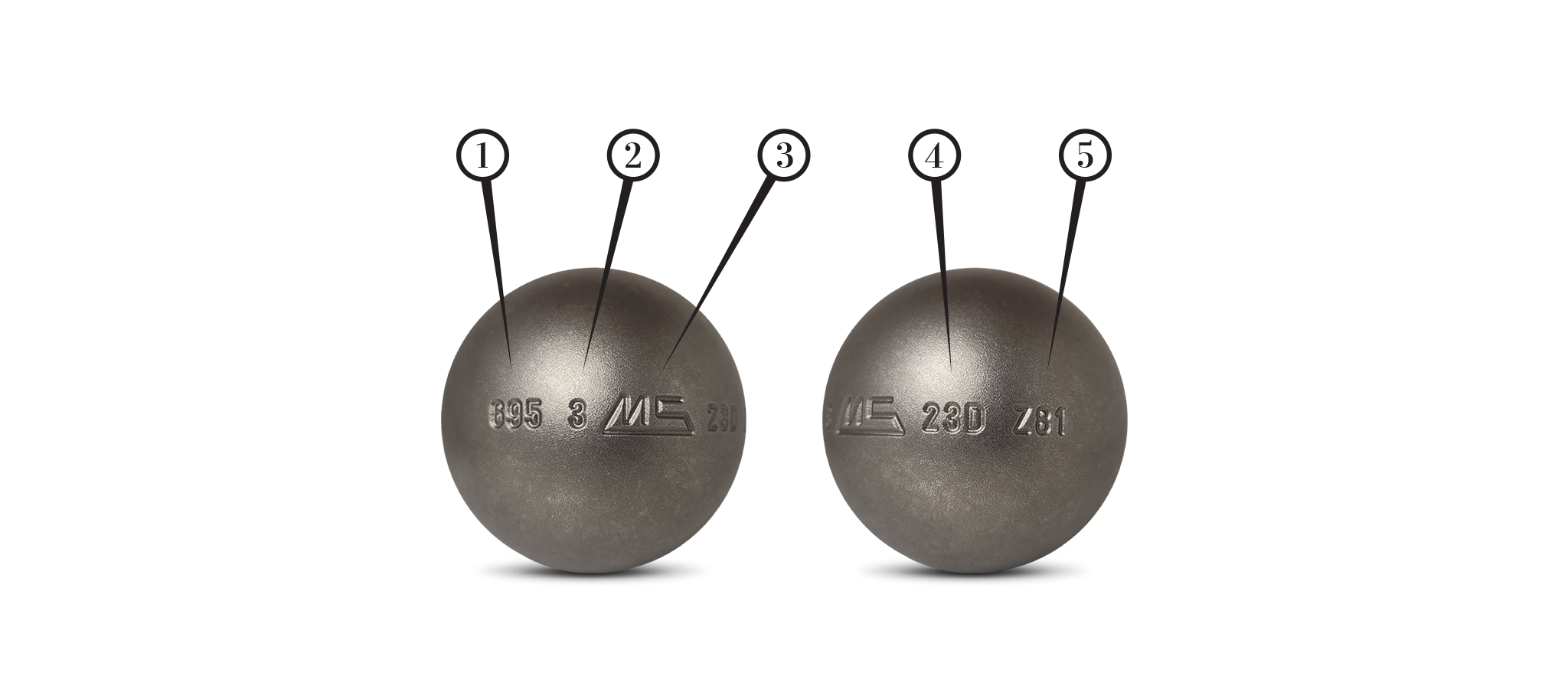Les boules MS Pétanque possèdent un marquage complet reprenant toutes les informations importantes sur celles-ci :